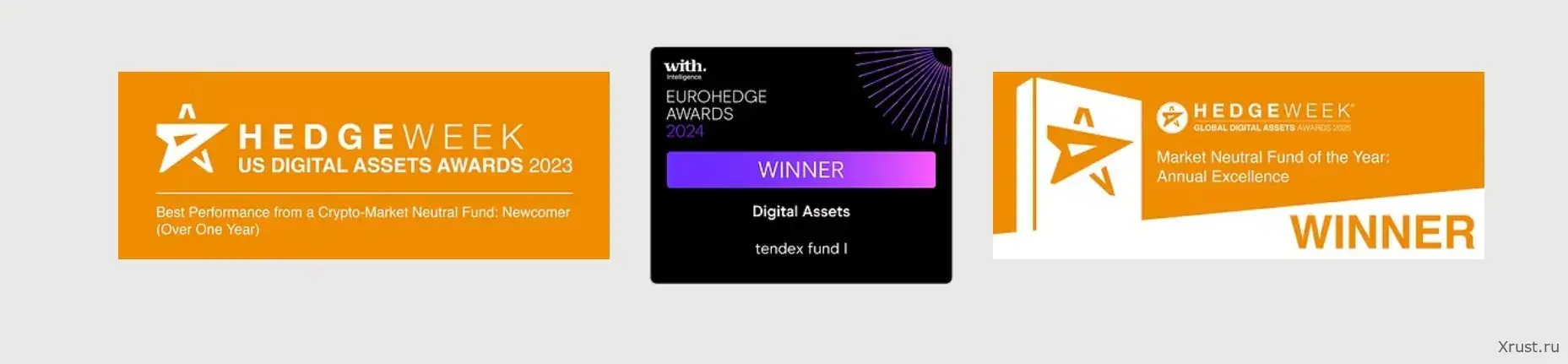 Три награды за три года. Слева: Hedgeweek US Digital Assets Awards 2023 — Best Performance from a Crypto-Market Neutral Fund. По центру: EuroHedge Awards 2024 — WINNER, Digital Assets, tendex fund I. Справа: Hedgeweek Global Digital Assets Awards 2025 — WINNER, Market Neutral Fund of the Year: Annual Excellence.