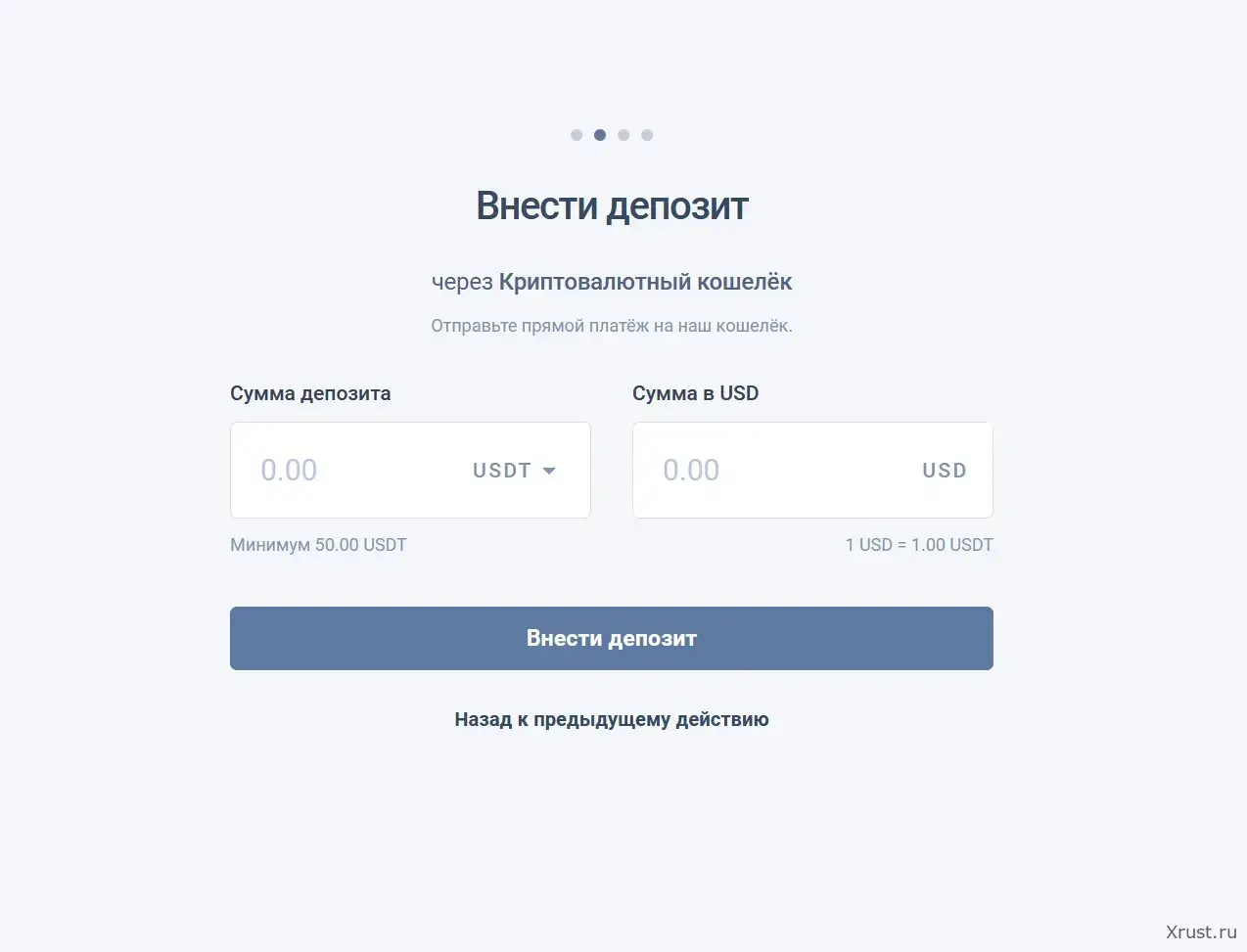Страница внесения депозита. Пополнение через криптовалютный кошелёк прямым платежом. Минимум — 50 USDT. При возникновении сложностей с конкретной сетью или кошельком — персональный менеджер подбирает альтернативное решение индивидуально.
