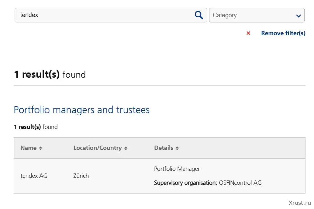 Реестр авторизованных институтов FINMA. Поиск по запросу «tendex» — 1 результат: tendex AG, Zürich, Portfolio Manager. Надзорная организация: OSFINcontrol AG. Это обязательное требование швейцарского закона FINIG, не опция.