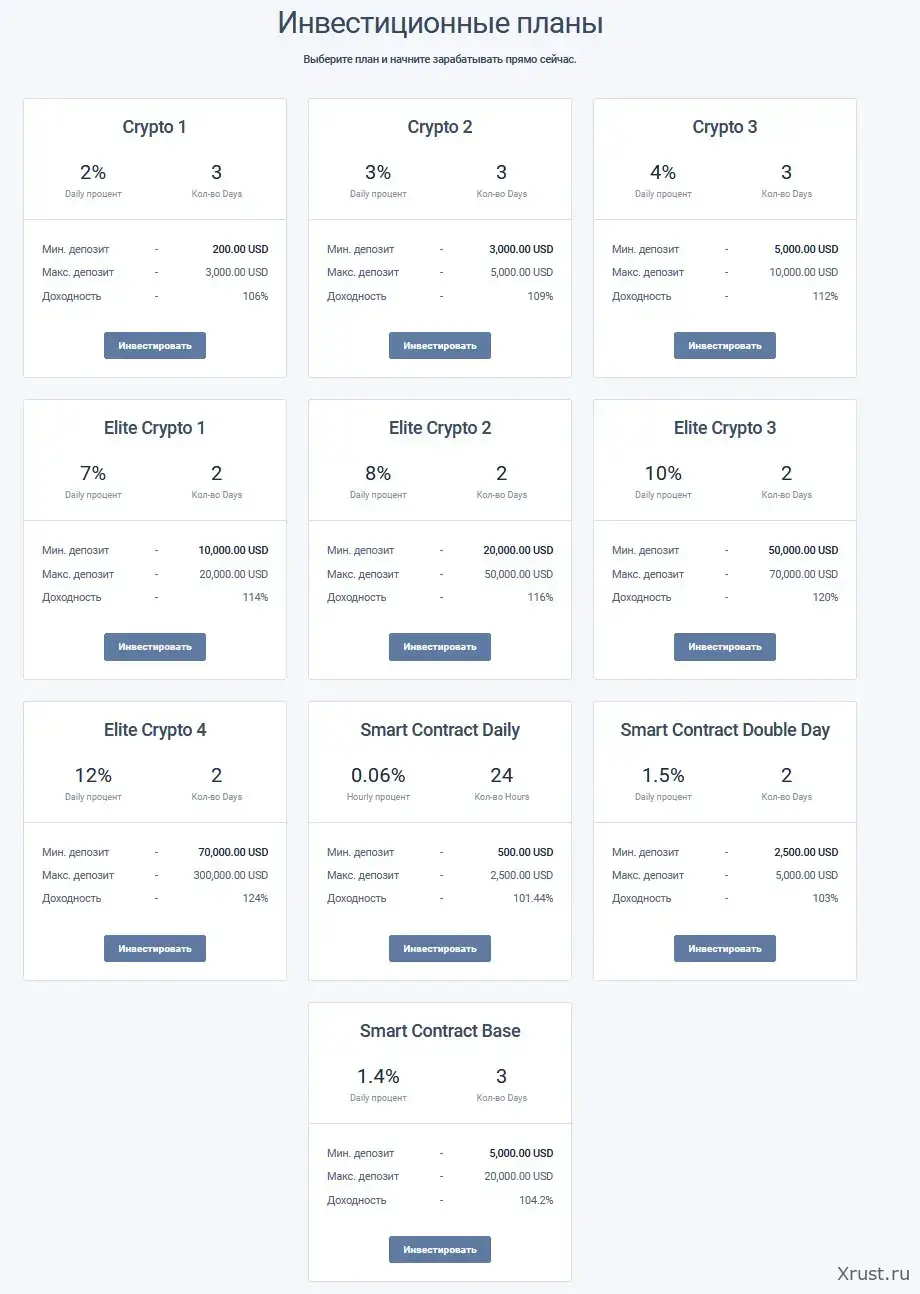 Линейка инвестиционных планов. Серии Crypto (вход от 200 USD), Elite Crypto (от 10 000 USD), Smart Contract (через блокчейн-протоколы). Каждый контур технически изолирован и требует отдельной заявки.
