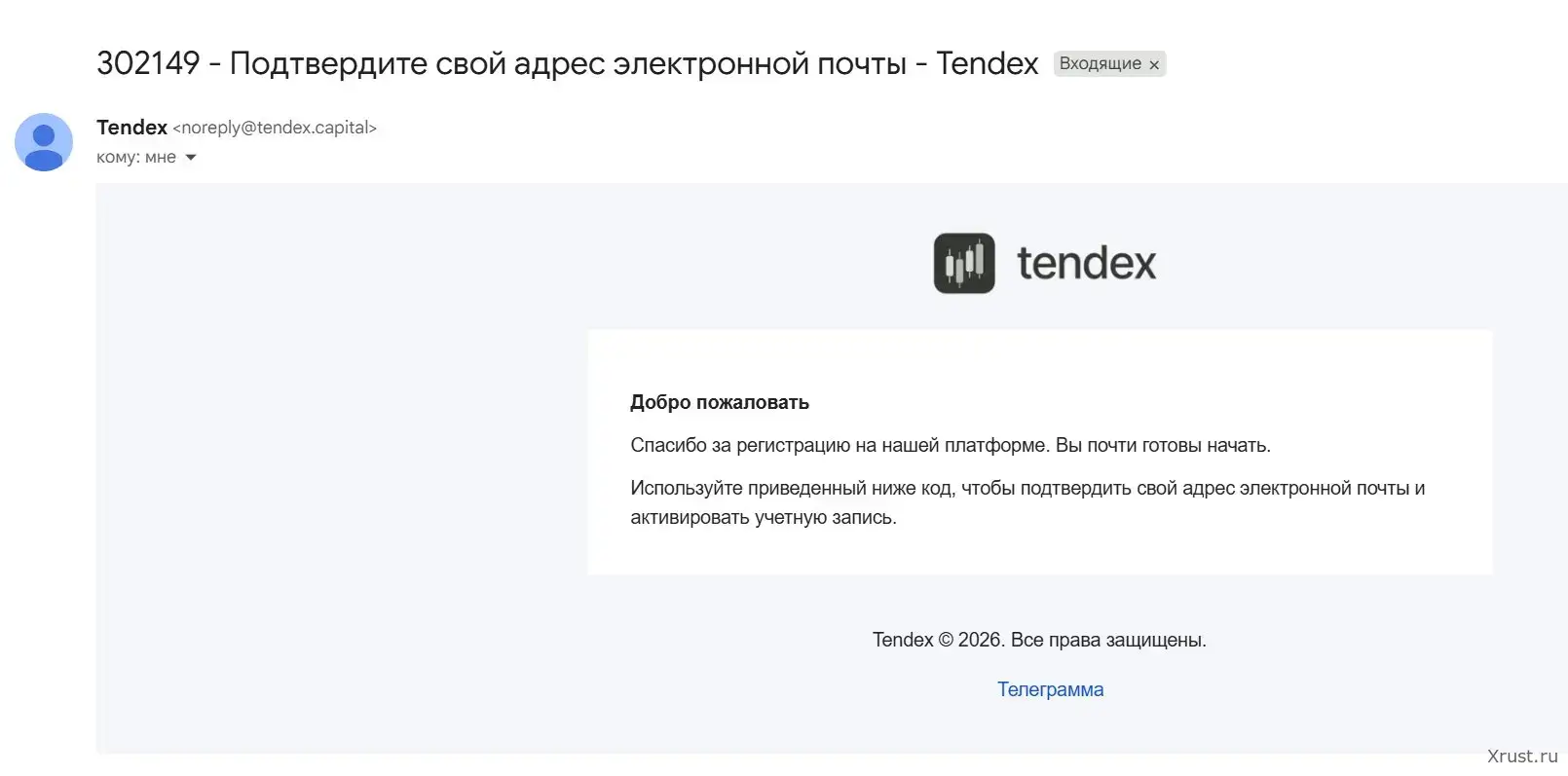 Письмо с подтверждением. Отправитель: noreply@tendex.capital — корпоративный домен. Внутри — код для активации аккаунта. Время доставки: около 1 минуты.