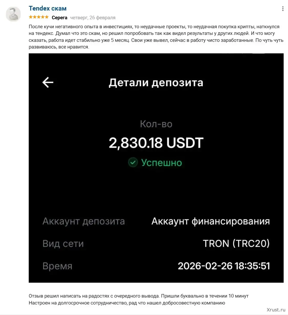 По данным пользователей и собственным тестам редакции, вывод средств через сеть TRC20 (Tron) занимает в среднем 15–30 минут после подачи заявки. Комиссия фонда составляет 6% от суммы вывода — прозрачно указана заранее, скрытых удержаний нет.