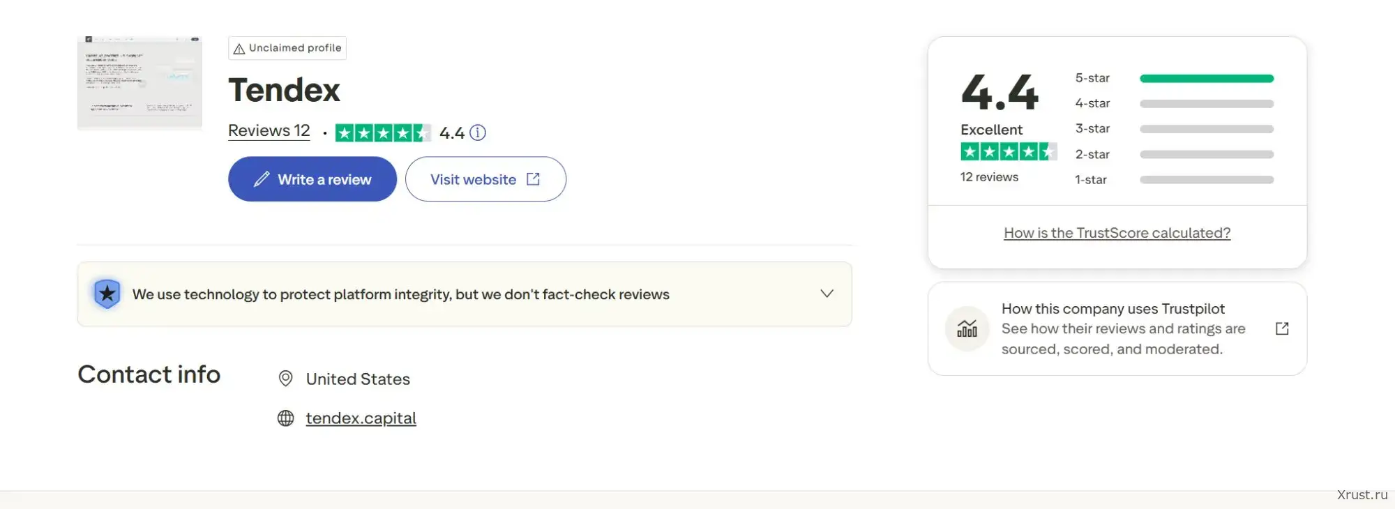 Tendex на Trustpilot. Рейтинг 4.4 из 5, статус Excellent. 12 отзывов, большинство — пятизвёздочные. Сайт tendex.capital подтверждён.