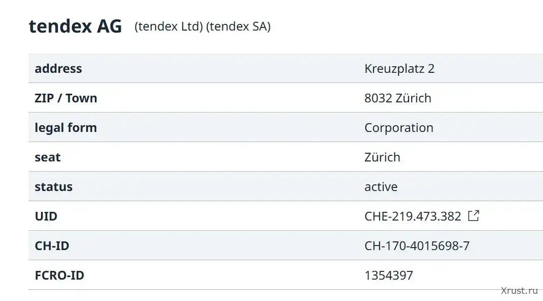 Компания tendex AG зарегистрирована в официальном федеральном торговом реестре Швейцарии. Проверить можно напрямую на zefix.ch по идентификатору 1354397.