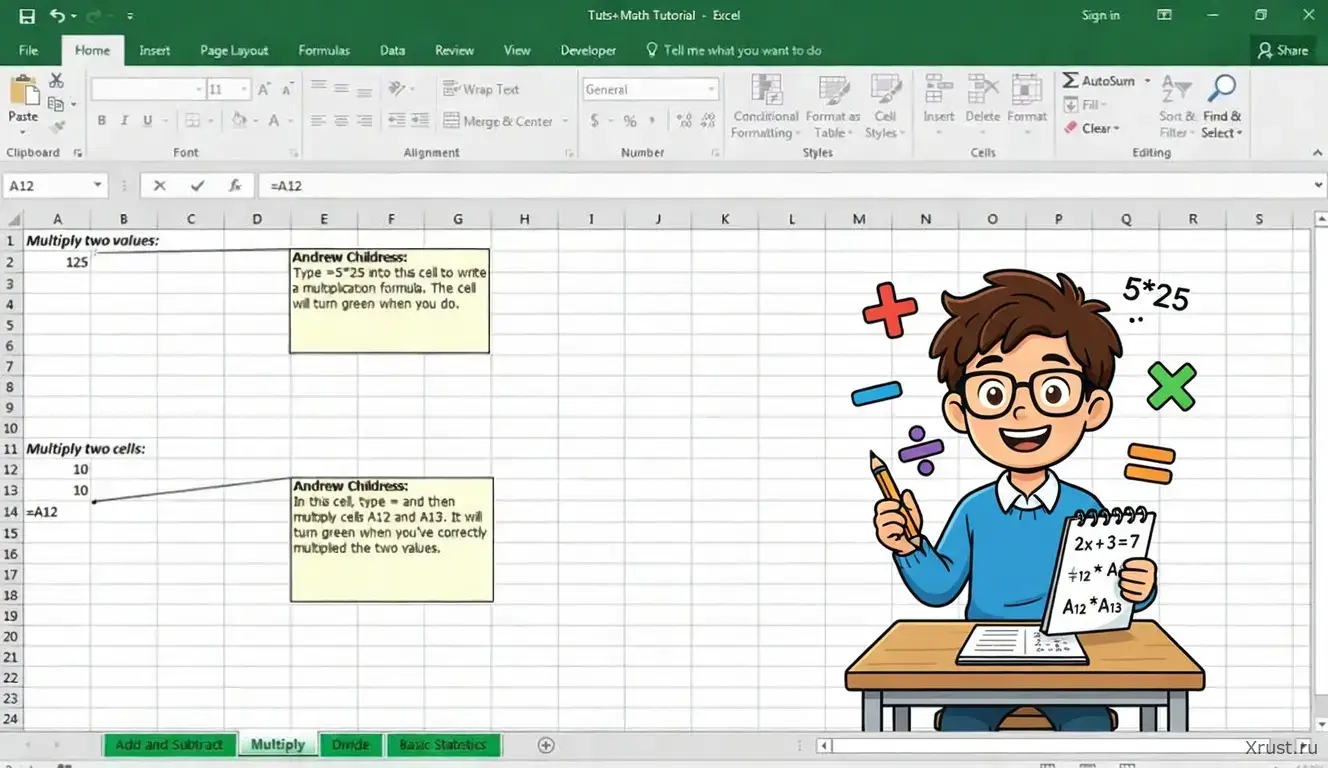 Столкнулись с классической математической задачей, где известна сумма и разность двух чисел, но не знаете, как быстро посчитать это в таблице? В этой статье мы с xrust разберем простое математическое правило, переведем его на язык формул Excel и создадим универсальный калькулятор для мгновенного решения подобных задач. Чтобы решить эту задачу, сначала найдем сами числа математически, а затем запишем формулы для Excel. Пусть первое (большее) число — это (x), а второе — (y). У нас есть система уравнений: (x + y = 2588) (x - y = 148) Часть 1. Решение в конкретных числах Математический расчет: Сложим два уравнения: ((x + y) + (x - y) = 2588 + 148) (2x = 2736) (x = 2736 / 2 = 1368) Подставим (x) в первое уравнение: (1368 + y = 2588) (y = 2588 - 1368 = 1220) Пошаговое решение в Excel: Откройте пустой лист Excel. В ячейку A1 введите число 2588 (сумма). В ячейку A2 введите число 148 (разность). В ячейку A3 введите формулу для поиска первого числа: =(A1+A2)/2 (результат: 1368). В ячейку A4